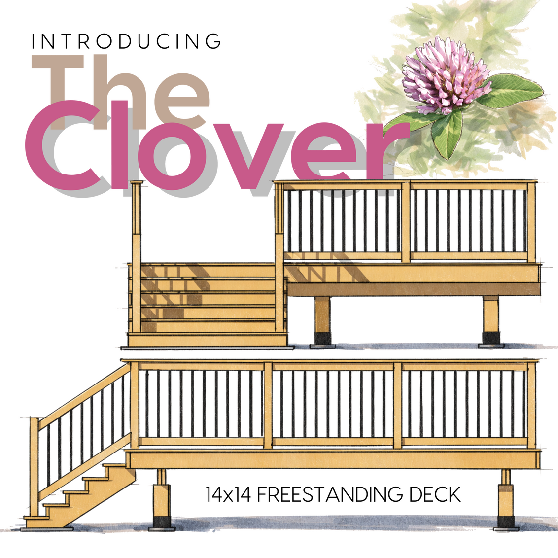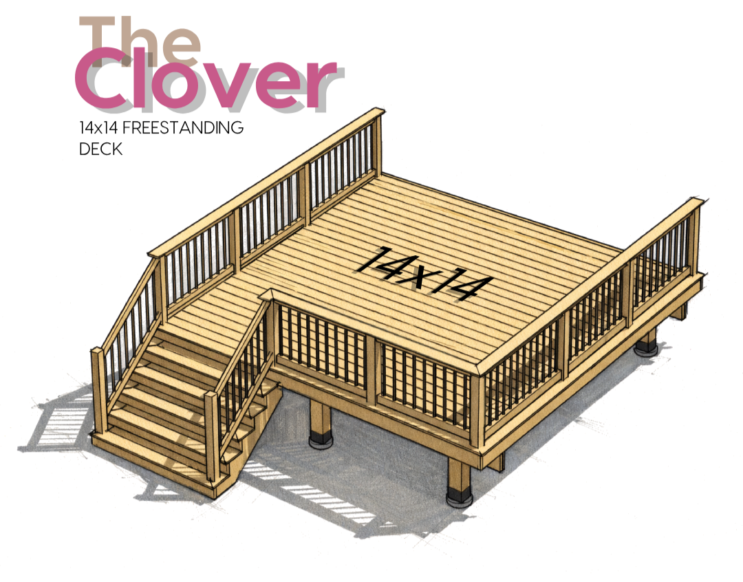 The Clover is a 14′ × 14′ freestanding deck defined by a clean, square layout and a low-profile presence. A single, centered stair creates a clear point of entry, while the continuous railing and picture frame border establish a strong, balanced perimeter. The proportions are intentionally restrained, giving the design a calm, grounded character that integrates easily into a wide range of backyard conditions without overpowering the space. Its symmetry and clarity allow it to feel both structured and adaptable, providing a composed foundation for everyday outdoor use. See below for the build specs.