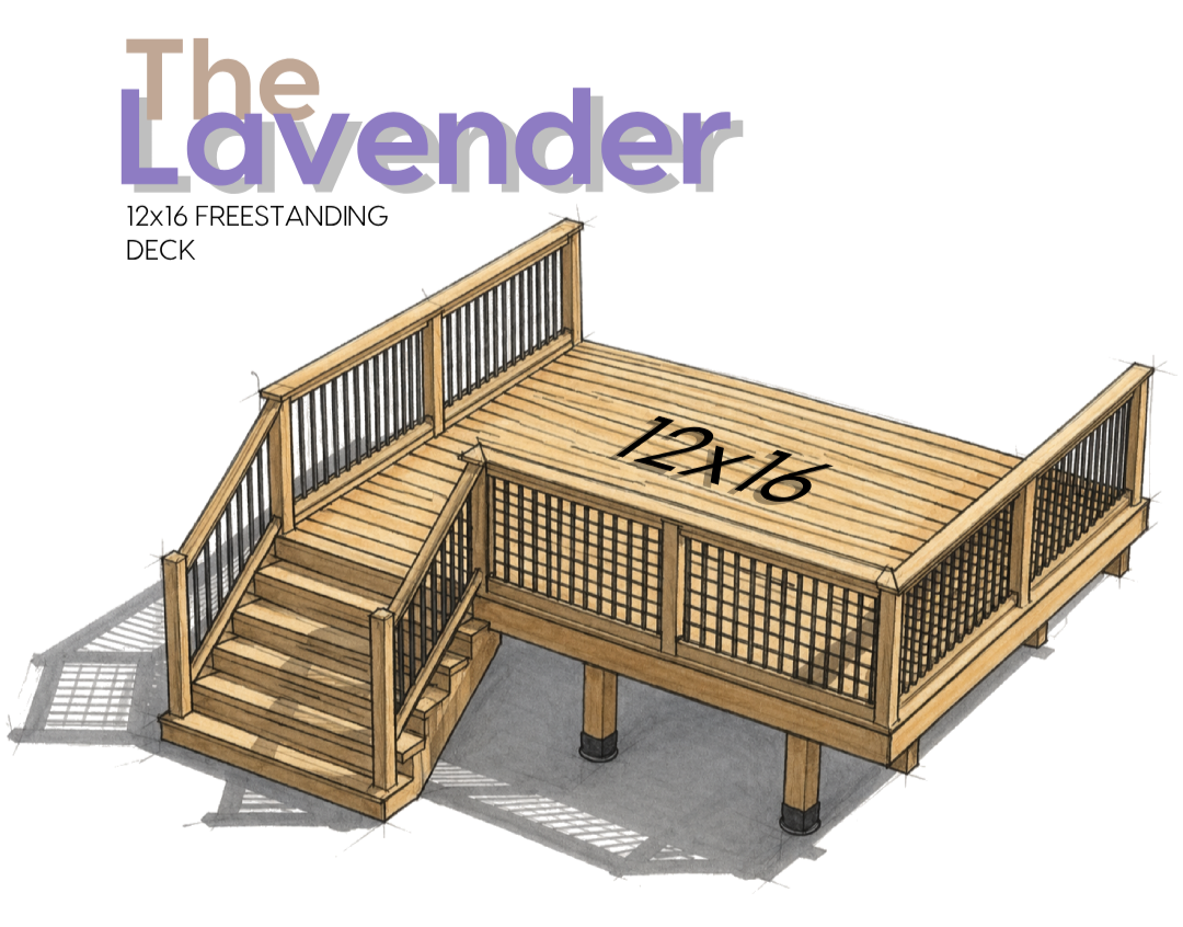 The Lavender is a 12′ × 16′ freestanding deck defined by an elongated rectangular layout and a low-profile presence. A single, offset stair establishes a natural point of entry, while the continuous railing and picture frame border create a clean, unified edge. The extended proportions give the design a slightly more directional feel, making it well suited for linear backyard spaces or placement along a primary axis. The geometry remains intentionally simple, allowing the deck to integrate easily into a range of site conditions without dominating the surrounding area. Its balanced composition and clear organization provide a structured yet flexible foundation for everyday outdoor use. See below for the build specs.